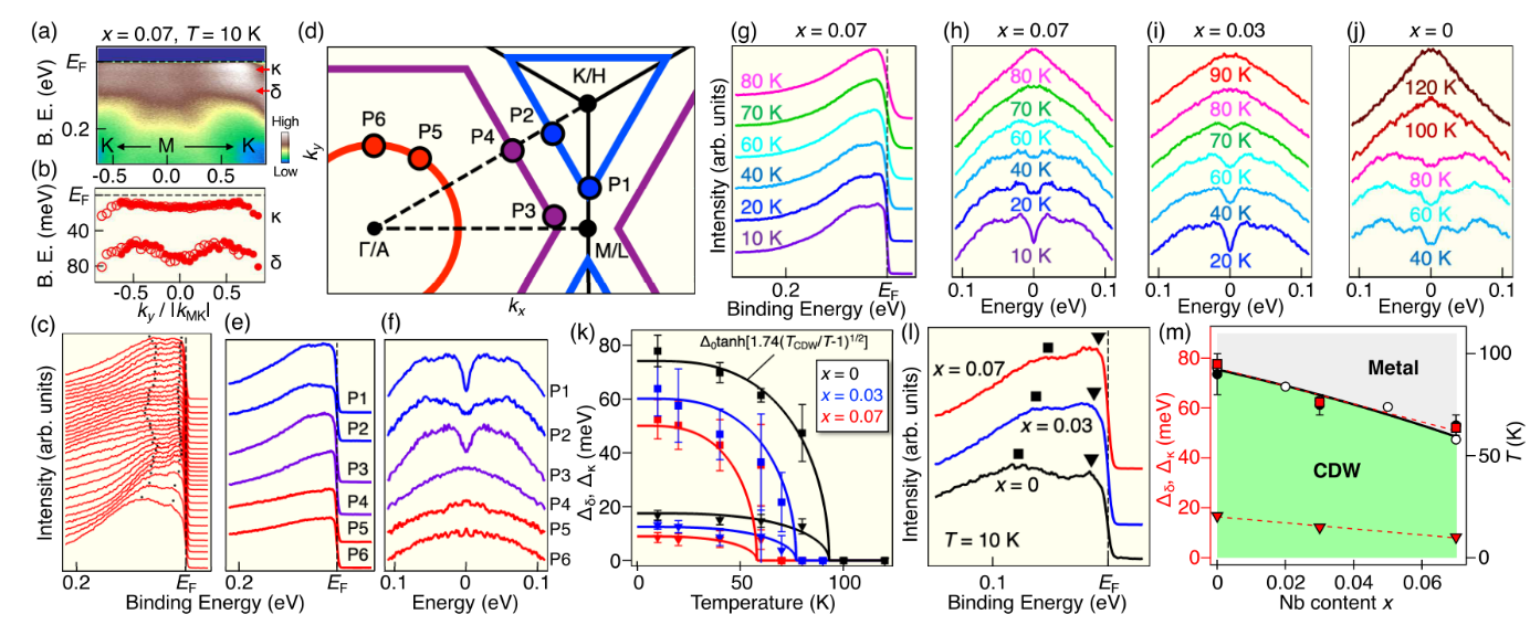 為了進一步驗證我們的理論計算并研究Nb摻雜對CsV3Sb5體系的電子能帶結構的影響,研究團隊與日本東北大學的T. Sato課題組合作,通過角分辨光電子能譜(ARPES)對Cs(V1-xNbx)3Sb5電子能帶結構開展了系統研究。ARPES結果顯示,隨著Nb元素的摻入,如圖4所示,Γ點處的Sb原子衍生的電子口袋(α帶)向下移動,而M點處V原子衍生的范霍夫奇點(δ帶)向上移動。此外,隨著Nb的摻雜,δ帶向上移動,導致范霍夫奇點遠離費米能級,從而導致電荷密度波轉變溫度TCDW變低且CDW強度越來越弱,如圖4、5所示。該結論表明電荷密度波的產生與范霍夫奇點緊密關聯。同時我們還發現,Nb摻雜導致超導轉變溫度Tc升高的內在物理本質是:Nb摻雜導致Sb衍生的α帶的電子口袋擴大和費米面處V衍生的電子態密度恢復共同作用導致超導電性增強。相關工作發表在Physical Review Letters上 [PRL, 129, 206402 (2022)]。