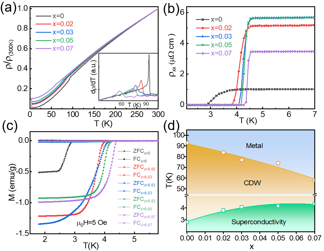 圖1. 不同Nb摻雜濃度的Cs(V1-xNbx)3Sb5中的電荷密度波和超導特性