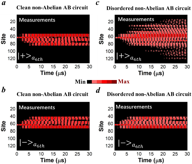 的電壓激發下,非阿貝爾AB籠電路的電壓動力學實驗結果。可以清晰看到,電壓信號局域在激勵點周圍并且展現初態依賴的空間局域化效應。電壓的空間局域化分布與理論完全一致。而對于無序非阿貝爾AB籠電路,具有贗自旋依賴的局域化和退局域化效應可以被觀察到,如圖3c和3d所示。其中,初始激勵形式為