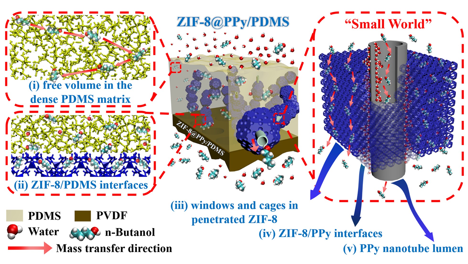 受到珍珠項鏈的啟發(fā),“MOF男孩”設(shè)計制作了一條新穎的“MOF項鏈”作為禮物送給自己心儀的女孩。團隊首先以甲基橙為模板,制備了聚吡咯納米管(PPy nanotube),之后誘導(dǎo)ZIF-8在PPy nanotube外壁成核生長,得到一種具有特殊“項鏈狀”高度連續(xù)MOF結(jié)構(gòu)(ZIF-8@PPy),ZIF-8晶體粒子晶面窗孔“對接”形成相對連續(xù)分子通道,PPy nanotube在穿引MOF晶體顆粒的同時為客體分子提供了管內(nèi)連續(xù)的快速擴散通道。進而,研究者將這種新穎的“MOF項鏈”引入到聚二甲基硅氧烷(PDMS)中,制備出了一種高性能混合基質(zhì)膜。通過膜材料自由體積測定,結(jié)合分子動力學(xué)模擬,解析了客體分子在膜內(nèi)的五種分子傳遞通道(圖2)的溶解-擴散行為。有趣的是,ZIF-8和PPy nanotube界面處所組成的“小世界”(“Small World”),在不改變ZIF-8固有結(jié)構(gòu)的情況上,能有效抑制水分子的連續(xù)傳遞,從而提高了膜對丁醇分子的滲透選擇性。