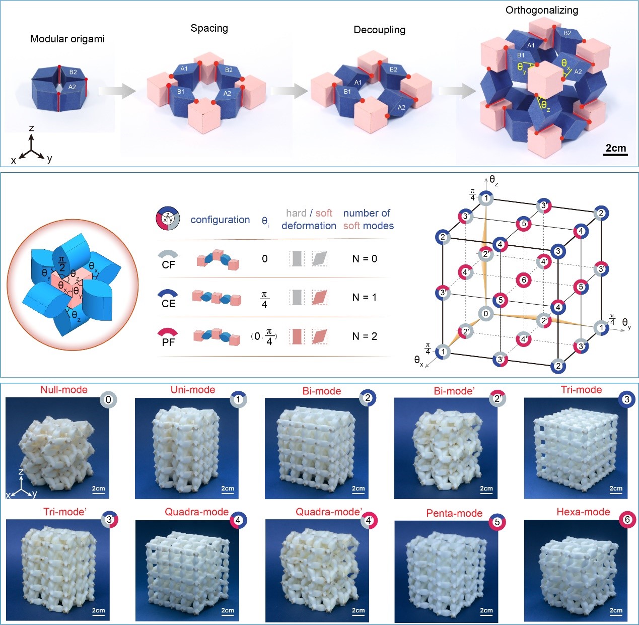 該論文的研究人員提出了一種零能模式可調的三維力學超材料,通過設計機構自由度相互解耦的三維模塊化折紙結構,首次實現了從零模式到六模式的設計空間覆蓋以及構型之間的可逆轉換。此外,研究人員采用3D打印技術制備了由熱塑性聚氨酯構成的樣品,驗證了多種參數配置下超材料的靜力學特性和可重構屬性,并對彈性波的可編程極化控制功能進行了探索和驗證,為可編程變構型超材料在聲學、光學、電磁學等多個領域的應用提供了參考。