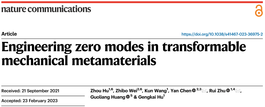 編輯:趙亞康 審核:龍騰 閱讀次數:近日,北京理工大學大學宇航學院朱睿教授、胡更開教授研究組聯合天津大學陳焱教授研究組和美國密蘇里大學黃國良教授在可重構力學超材料研究方面取得新進展。相關成果以“Engineering zero modes in transformable mechanical metamaterials”為題,在Nature Communications上發表[Nat Commun (2023) 14:1266]。北京理工大學為第一通訊單位,北京理工大學宇航學院朱睿教授、天津大學陳焱教授為共同通訊作者,北京理工大學博士生胡洲和天津大學博士生魏志波為共同一作。該工作得到了國家自然科學基金委的資助。