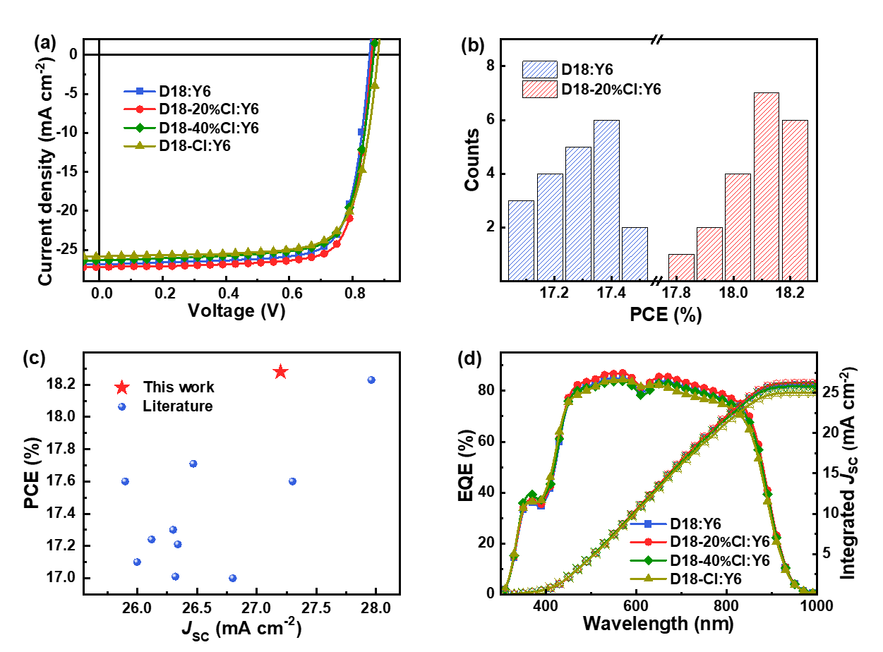 圖2:(a)太陽能電池的 J-V 曲線;(b)基于D18:Y6,D18-20%Cl:Y6器件的PCE統計直方圖;(c)文獻中報道基于三元聚合物給體器件PCE與 JSC 統計;(d)EQE外量子效率圖。