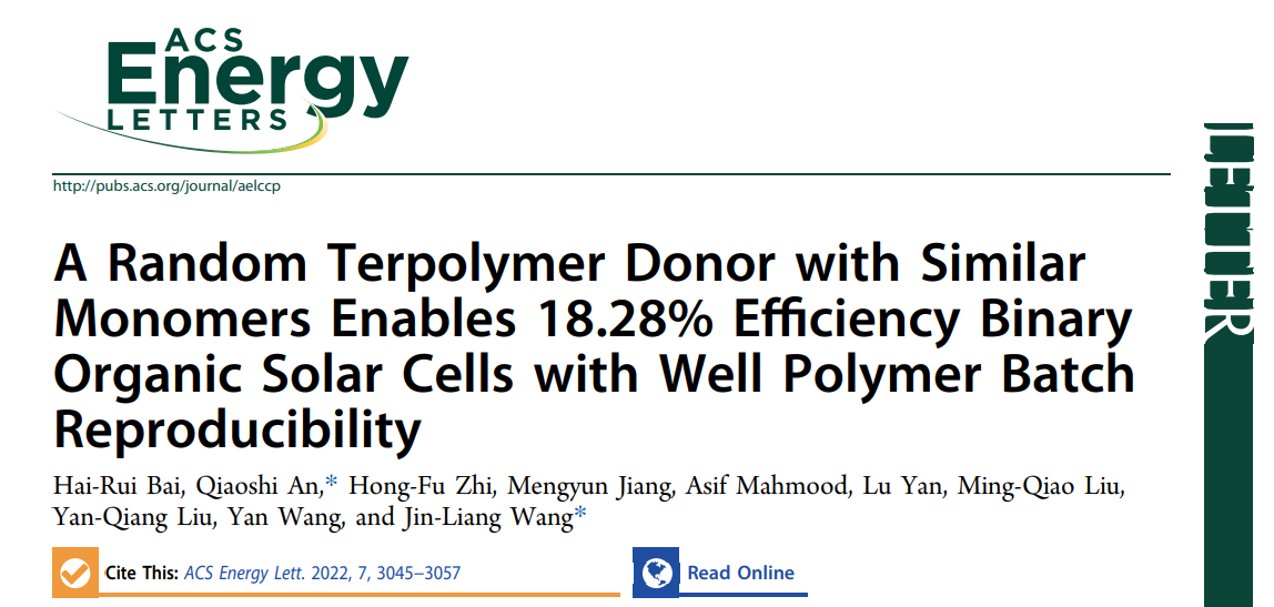 編輯:段凱龍 審核:王振華 閱讀次數:近日,北理工化學與化工學院王金亮教授團隊在構筑高效率且批次穩定的有機太陽能電池聚合物給體材料方面取得重要進展,相關研究成果發表在國際能源領域著名期刊《ACS Energy Letters》(DOI: 10.1021/acsenergylett.2c01316)上,題為“A Random Terpolymer Donor with Similar Monomers Enables 18.28% Efficiency Binary Organic Solar Cells with Well Polymer Batch Reproducibility”。北京理工大學為唯一作者通訊單位,化學與化工學院王金亮教授與安橋石特別研究員為該論文的通訊作者,博士研究生白海瑞為論文的第一作者,本科生劉明樵(其本科畢業論文被評為2021年北京市普通高等學校優秀本科生畢業設計(論文))為共同作者。
