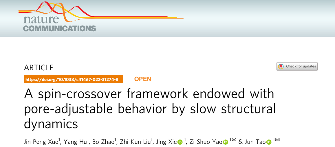 編輯:隆哲源 審核:王振華 閱讀次數:近日,北理工陶軍教授團隊在構筑柔性自旋交叉多孔材料方面取得進展,相關研究成果以“A spin-crossover framework endowed with pore-adjustable behavior by slow structural dynamics”為題目,在國際知名期刊《自然通訊》(Nature Communications)上發表(DOI:10.1038/s41467-022-31274-8)。北京理工大學為唯一作者單位,化學與化工學院陶軍教授和姚子碩特別研究員為文章共同通訊作者,博士研究生薛金鵬為該論文的第一作者,化學與化工學院謝靜教授在計算方面提供了幫助。