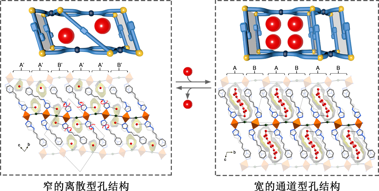 主客體相互作用在實現材料的可切換結構與功能方面發揮著重要作用,但合理的設計與控制仍具有挑戰。柔性金屬有機框架材料(Flexible metal-organic frameworks, FMOFs)因其結構的可調節性和主客體相互作用的密切關聯引起了研究者廣泛的關注。在結構轉變的過程中,金屬中心的配位構型變化有可能導致材料磁學性質的變化。這種磁性多孔材料擴寬了多孔材料的應用前景,并且為主客體相互作用機理的理解提供了新的途徑。