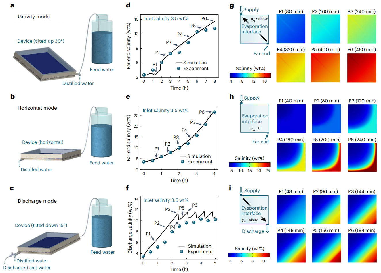 圖2. 單級裝置實驗與仿真 (a)-(c) 三種運行模式;(d)-(f) 鹽度實驗結果;(g)-(i) 蒸發表面鹽度仿真結果