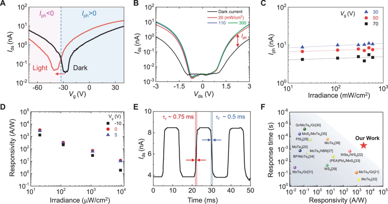 圖2. 隧穿光電晶體管性能。(A)黑暗條件和光照條件下的轉移曲線。(B)在黑暗條件和三種不同功率激光照射下,Ids與Vds的關系。(C)在Vg="30、50和70V且Vds=3V時,光照下功率相關的光電流。(D)在三個不同柵極電壓(λ=638nm)下,響應率與光功率密度的關系。(E)時域中的光電晶體管開關操作。(F)光電晶體管的響應時間和響應率的比較。
