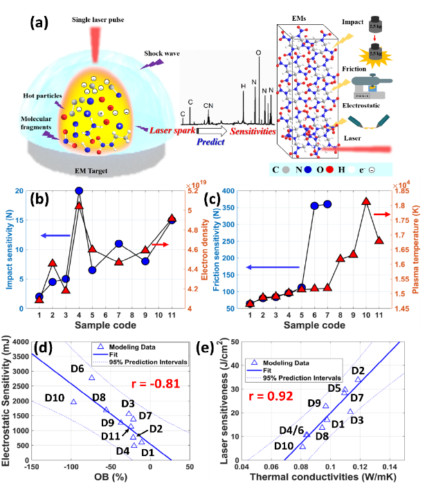 將脈沖激光聚焦到樣品表面微米級范圍內,焦點處產生激光等離子體,為含能材料的分解提供了一個局部高溫高壓環境。在高溫等離子體火花中,伴隨著強烈的放熱化學反應,原子、離子、電子、分子碎片和一些自由基等相互碰撞,如圖2(a)所示。化學反應釋放能量需要電子參與,從而極大的影響了電子的冷卻和復合過程。不同分子和晶體類型的含能材料的解離程度和解離速率都與感度有關,等離子體溫度和電子密度都可以由譜線強度給出。研究表明,電子密度和撞擊感度、等離子體溫度和摩擦感度具有一定的關聯性(如圖5(b-c))。因此可以通過激光誘導等離子體的有效總輻射譜來評價含能材料的感度,結合等離子體特征光譜和統計學算法,可以很好地建立撞擊、摩擦、靜電和激光等感度預測模型,預測模型平均相對誤差低于10%。該成果作為封底文章發表在原子光譜分析領域最高水平的學術期刊Journal of Analytical Atomic Spectrometry(2021, 36, 2603)上。