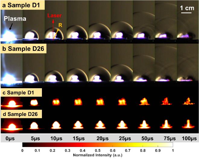物理機制探索:弄清了激光與含能材料相互作用的微觀物理機制,及超快等離子體過程和微爆動態物理化學過程相關演化機理,證明了激光微爆過程與宏觀爆轟存在的強關聯物理特性,并提出了微爆動力學物理模型,如圖1所示。因此,可以通過對微爆過程的精密物理測量和分析,完成對含能材料爆速、爆壓、生成焓等參數的定量分析以及爆溫的預測。該成果發表在光學頂級期刊Optics Express上(Opt. Express, 2022, 30(4): 4718-4736.)
