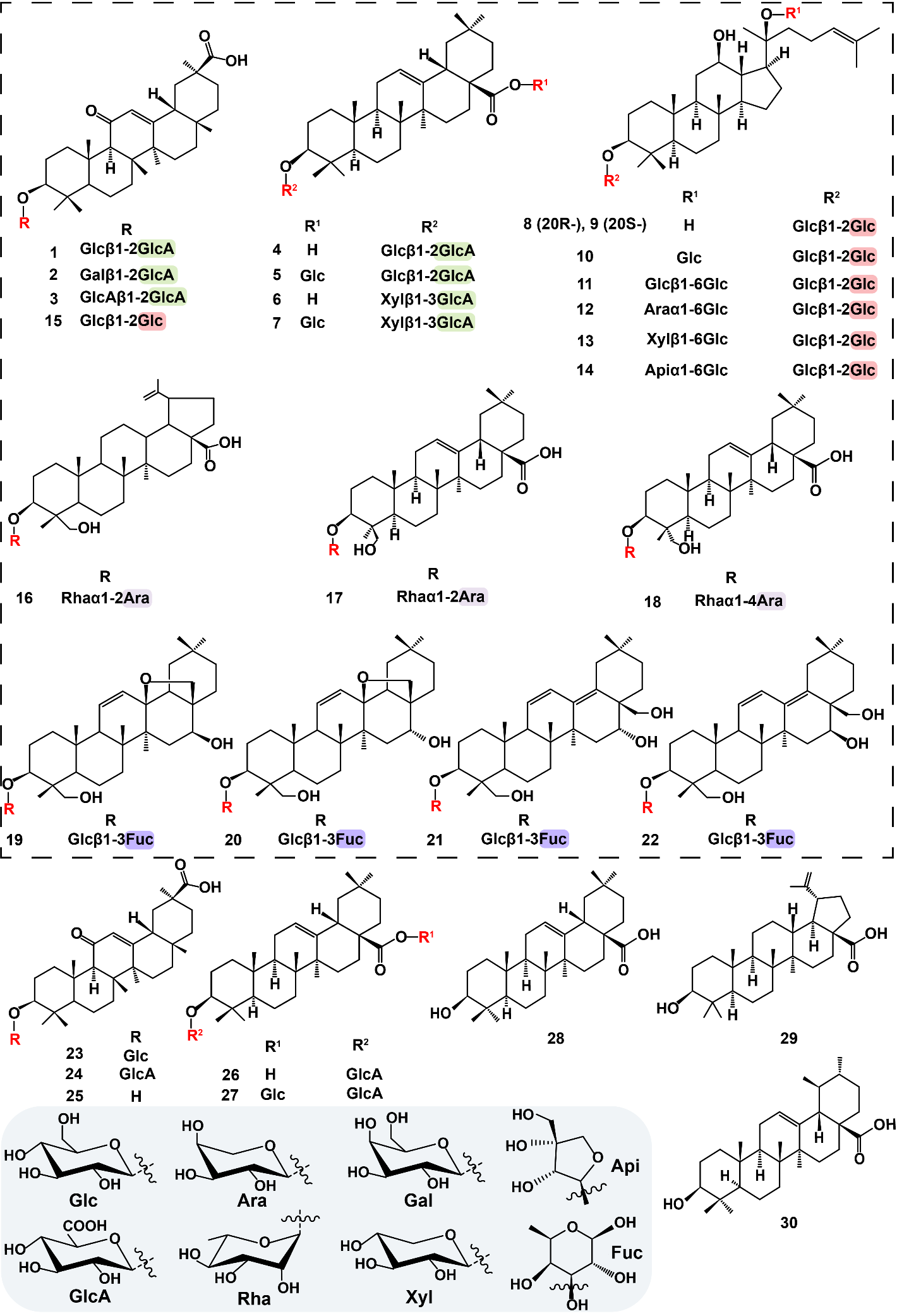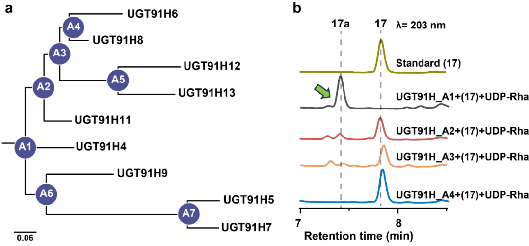 利用祖先酶序列重構技術獲得UGT91H亞家族的祖先酶UGT91H_A1, 其在保留UGT91H亞家族現代酶直鏈三糖基修飾功能外,表現出了更廣的底物譜和更高的活性。在糖基受體方面,UGT91H_A1可催化17個三萜化合物修飾一分子糖基。在糖基供體方面,除UDP-Rha和 UDP-Xyl之外,UGT91H_A1還具有高效利用UDP-葡萄糖(UDP-Glc)的活性。最后利用UGT91H_A1成功合成了 33個三萜直鏈三糖苷。