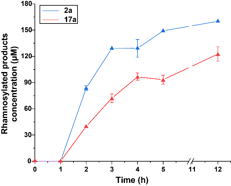 針對糖基供體UDP-Rha成本高的問題,構建了包括蔗糖合酶 Gu SUS1-Δ9、UDP-Rha 合酶 At RHM2和雙功能鼠李糖合酶 At NRS/ER的三酶級聯體系,實現了以廉價的蔗糖為原料合成UDP-Rha。將該體系與UGT91H_A1偶聯的四酶體系(分步法)降低了甘草次酸 3- O -GlcA-Gal-Rha(2a)和常春藤皂苷元 3- O -Ara-Rha-Rha(17a)的合成成本,底物轉化率分別達到80.1 ± 0.3%和61.3 ± 4.1%。