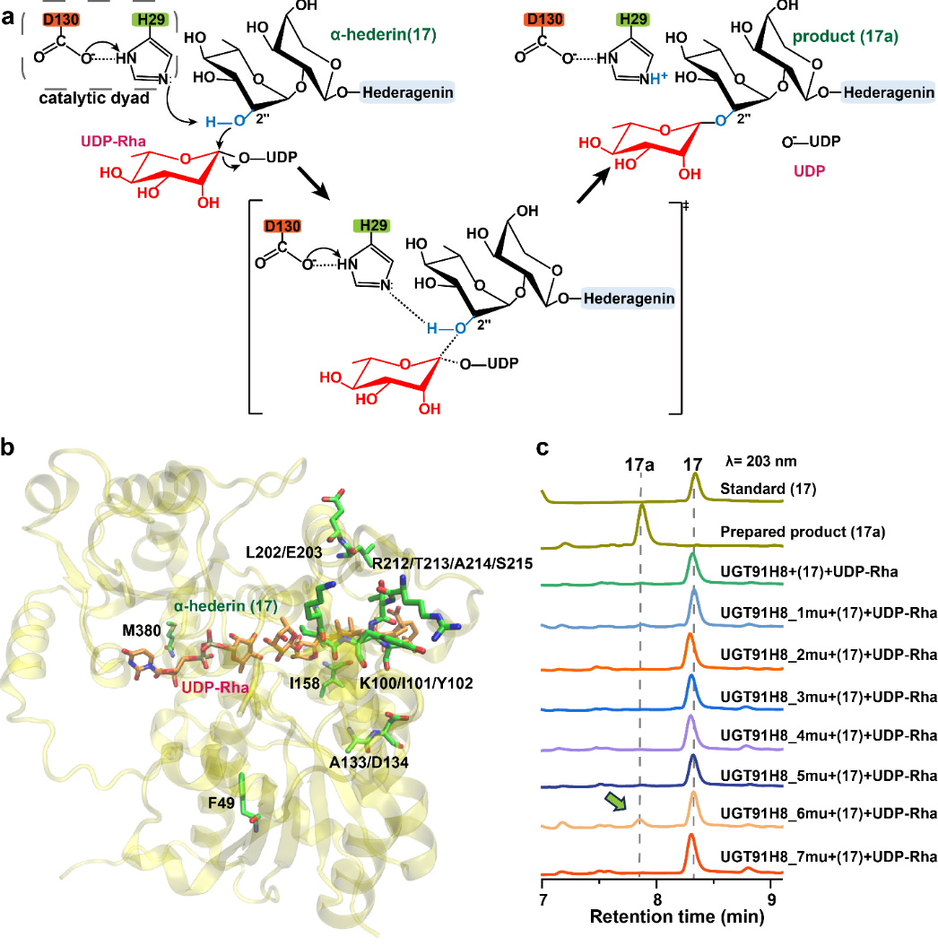 進一步闡明了UGT91H_A1中非保守的RTAS Loop對UGT91H亞家族酶的底物特異性具有重要影響。將RTAS Loop替換至UGT91H8 和UGT91H7對應區域,分別獲得突變體UGT91H_6mu和UGT91H7M,均具有催化新底物α-常春藤苷(17)糖基修飾的活性。分子動力學模擬和量子力學計算表明,RTAS Loop通過影響酶和底物的相互作用和結合能來調控酶的底物特異性。