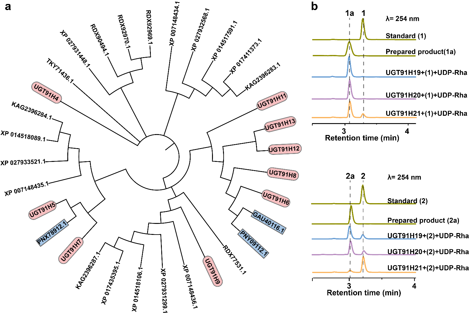 以上述表征的UGT91H亞家族酶的序列為探針,建立了基于進化分析的快速酶挖掘方法,對NCBI數據庫中8種豆科植物基因組進行系統分析和挖掘,共獲得23個候選酶,最終證實19個為UGT91H亞家族酶,大大提高了酶挖掘的效率和準確性。從中挑選了PNY09112.1、GAU40116.1和PNX78912.1進行功能表征,均表現出對三萜化合物C2 '' -OH特異性修飾一分子鼠李糖基或木糖基的活性。此外,GAU40116.1和PNY09112.1還對UDP-Gal具有微弱的新活性。