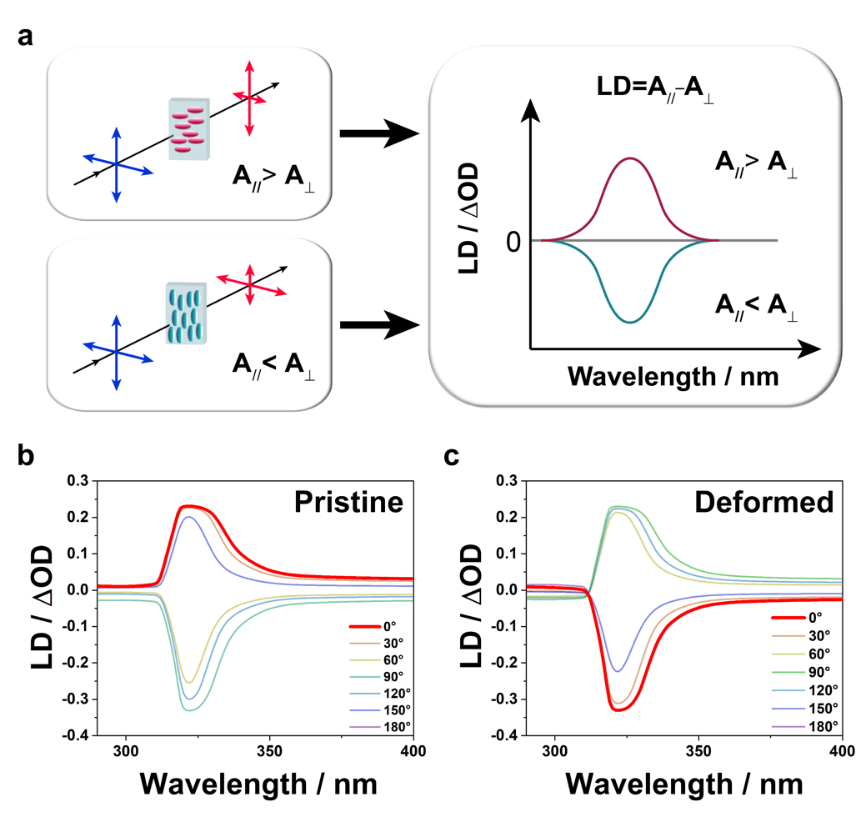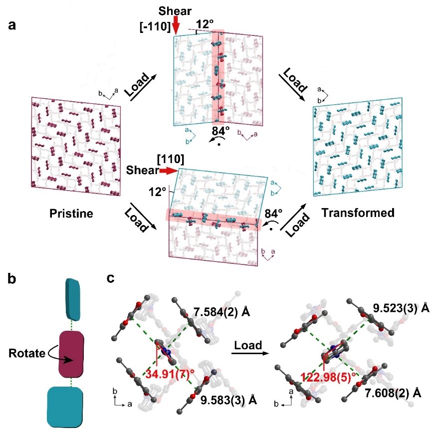 該研究基于壓力作用下分子取向變化與超彈性質的結構關聯出發,設計合成了新的晶態分子“陀螺”— (3,5-二甲基苯甲酸)-(4,4’-聯吡啶)-(3,5-二甲基苯甲酸),利用4,4’-聯吡啶在剪切力作用下繞氫鍵軸的90°旋轉,實現了單晶的無擴散形變。當撤去外力時,變形晶體迅速恢復初始狀態,表現出優異的超彈性能。這種可逆的應力變形具有良好的重復性,經數十次操作,單晶無明顯破損。由于4,4’-聯吡啶分子平面的90°轉動改變了晶格內部躍遷矩的分布,材料線二色性信號在受力狀態下發生可逆反轉。