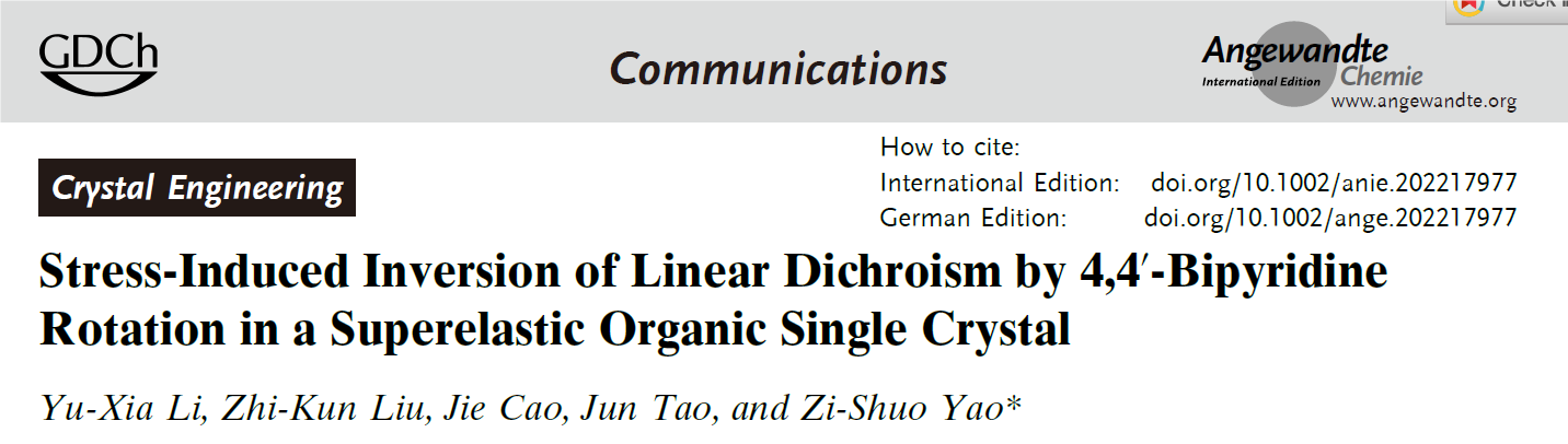 編輯:段凱龍 審核:王振華 閱讀次數:近日,北京理工大學化學與化工學院姚子碩研究員在超彈性分子基單晶材料研究中取得重要進展。相關工作以“Stress-Induced Inversion of Linear Dichroism by 4,4′-Bipyridine Rotation in a Superelastic Organic Single Crystal”為題,發表在國際著名化學期刊 Angew. Chem. Int. Ed. 。北京理工大學為唯一作者單位,化學與化工學院陶軍教授研究團隊的姚子碩研究員為文章通訊作者,文章第一作者為北京理工大學博士研究生李宇霞。