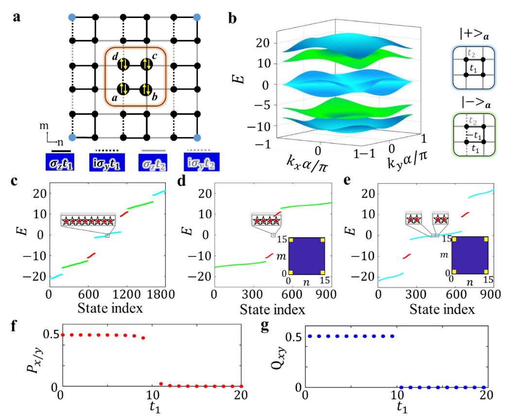 研究人員考慮具有U(2)非阿貝爾規(guī)范場(chǎng)的二維晶格模型,其中每個(gè)元胞包含四個(gè)子格點(diǎn)‘a(chǎn)’, ‘b’, ‘c’, ‘d’,且每個(gè)子格點(diǎn)具有一對(duì)內(nèi)部贗自旋|↑>a,b,c,d和|↓>a,b,c,d,如圖1a所示。元胞內(nèi)和元胞間的耦合是通過(guò)具有不同耦合系數(shù)t1和t2的泡利矩陣σz,σy來(lái)實(shí)現(xiàn)。泡利矩陣[σz,σy]≠0的不對(duì)易性保證了非阿貝爾規(guī)范場(chǎng)的存在。圖1b展示了非阿貝爾布洛赫能帶的計(jì)算結(jié)果,五條能帶由兩個(gè)正交子空間構(gòu)成。藍(lán)色和綠色能帶分別由一對(duì)耦合贗自旋|->d,|+>c,|->b,|+>a和|+>d,|->c,|+>b,|->a形成,其中|±>a,b,c,d="1/√2(|↑>a,b,c,d±|↓>a,b,c,d)是變換后的贗自旋基矢。右側(cè)插圖表示兩種子空間單獨(dú)對(duì)應(yīng)的有效晶格模型,其分別可以映射到不同的高階拓?fù)渚Ц衲P蜕稀P枰獜?qiáng)調(diào)的是非阿貝爾規(guī)范場(chǎng)破壞了系統(tǒng)的U(2)對(duì)稱性,使得兩個(gè)贗自旋在任何幺正變換下都無(wú)法分離,始終耦合在一起。這一特性是阿貝爾規(guī)范場(chǎng)所不具備的,即阿貝爾規(guī)范場(chǎng)所引起的內(nèi)部贗自旋是可以通過(guò)幺正變換進(jìn)行重組并分離的。因此,圖1b的每個(gè)正交子空間都包含一對(duì)耦合的贗自旋,使非阿貝爾規(guī)范場(chǎng)誘導(dǎo)的高階拓?fù)湫?yīng)源于內(nèi)部贗自旋的相互作用。為了探索非阿貝爾拓?fù)溥B續(xù)譜束縛態(tài)的存在,研究員計(jì)算了開邊界條件下系統(tǒng)的本征能譜,如圖1c所示。圖1d和1e分別展示兩種子空間的能譜,右下角插圖呈現(xiàn)了零能局域態(tài)的空間分布。結(jié)果表明在這兩個(gè)子空間中,都存在著高階拓?fù)浣菓B(tài),同時(shí)高階拓?fù)浣菓B(tài)的本征能量嵌入到平庸體態(tài)中,形成非阿貝爾拓?fù)溥B續(xù)譜束縛態(tài)。為了進(jìn)一步驗(yàn)證非阿貝爾拓?fù)溥B續(xù)譜束縛態(tài)的魯棒性,研究人員引入兩個(gè)子空間的耦合相互作用,使得非阿貝爾拓?fù)淠P蜔o(wú)法被分解為兩個(gè)解耦的子空間。通過(guò)計(jì)算最低能帶的Zak相位和第二,三能帶的電四極矩可以發(fā)現(xiàn),當(dāng)包內(nèi)耦合小于包間耦合時(shí)高階能帶拓?fù)淙匀淮嬖凇_@一現(xiàn)象進(jìn)一步證明非阿貝爾連續(xù)譜束縛態(tài)是由兩個(gè)不可分離的贗自旋相互耦合形成的。