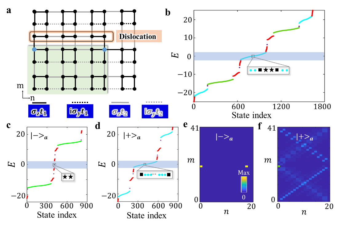 除了角點(diǎn)非阿貝爾拓?fù)溥B續(xù)譜束縛態(tài),研究人員發(fā)現(xiàn)在晶格位錯(cuò)缺陷處也存在非阿貝爾拓?fù)溥B續(xù)譜束縛態(tài)。圖3a展示非阿貝爾位錯(cuò)晶格模型示意圖。圖3b為晶格模型本征能譜。圖3c和3d顯示非阿貝爾本征能譜在兩個(gè)子空間的分解。其中綠色和藍(lán)色點(diǎn)用于標(biāo)記不同子空間的體態(tài),紅點(diǎn)對(duì)應(yīng)于一維邊界態(tài),紫點(diǎn)標(biāo)記零維局域態(tài)。三個(gè)插圖中的黑色星形和方形非別對(duì)應(yīng)嵌入到零能量周圍的缺陷局域本征模式,其空間分布在圖3e和3f中展示。結(jié)果表明其中一個(gè)子空間中的零能量本征態(tài),完美局域在位錯(cuò)位置。但在另一個(gè)子空間中的零能態(tài)則表現(xiàn)出明顯的擴(kuò)散現(xiàn)象,其源于位錯(cuò)位置對(duì)稱性的破壞。可以看到,錯(cuò)位缺陷引起的非阿貝爾拓?fù)溥B續(xù)譜束縛態(tài)只能存在于一個(gè)子空間。