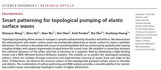 編輯:楊麗靜 審核:龍騰 閱讀次數:近日,北京理工大學大學宇航學院朱睿教授聯合美國密蘇里大學黃國良教授在彈性表面波拓撲輸運研究方面取得新進展。相關成果以“Smart patterning for topological pumping of elastic surface waves”為題,在Science Advances上發表[Sci adv (2023) 9, eadh4310]。北京理工大學宇航學院朱睿教授和美國密蘇里大學黃國良教授為論文的共同通訊作者。北京理工大學宇航學院博士研究生胡洲為論文的共同第一作者,完成了論文的樣品制備和實驗測試部分。該研究工作得到了國家自然科學基金委的資助。