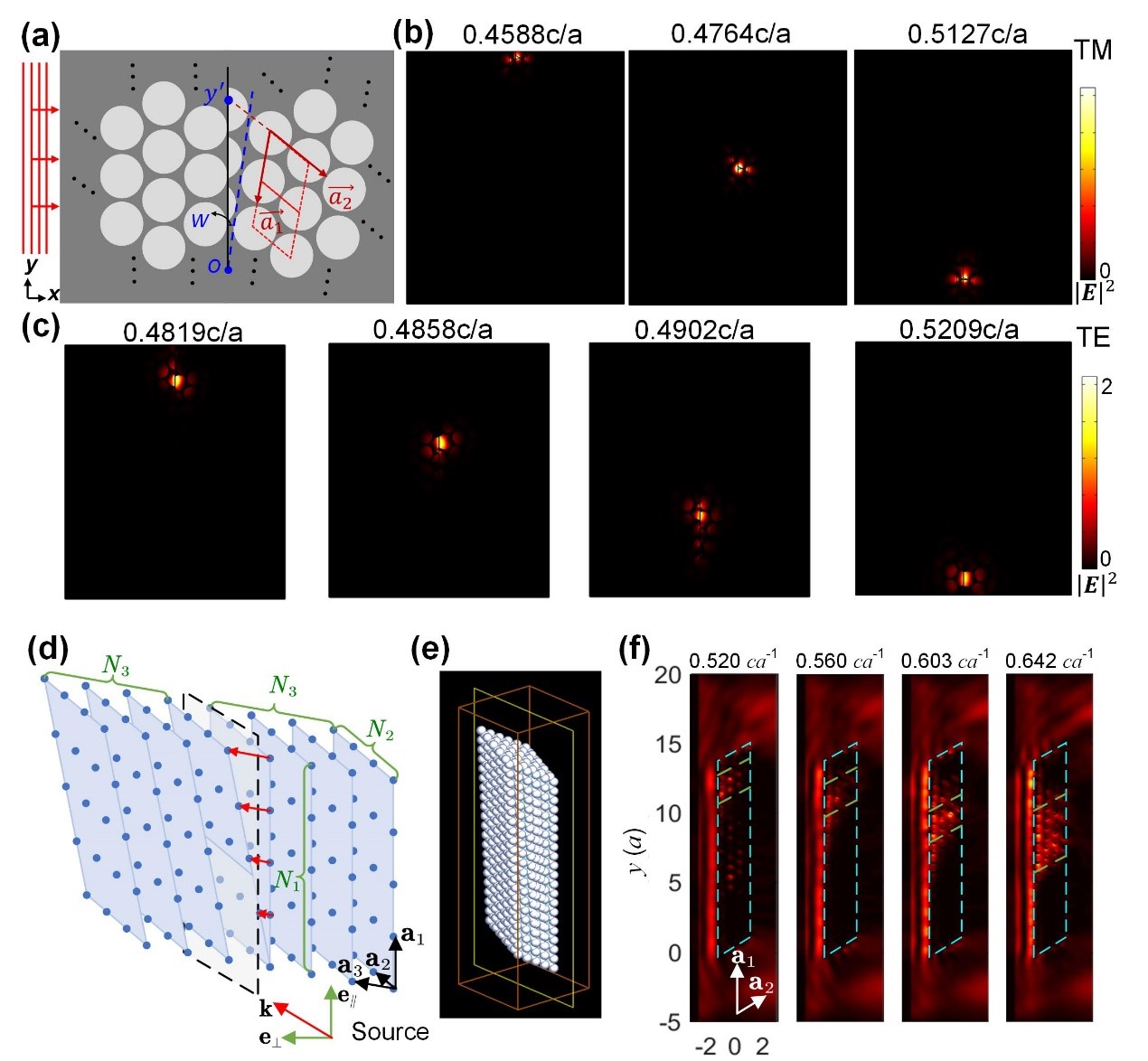 圖3 光子晶體晶格旋轉(zhuǎn)實(shí)現(xiàn)的拓?fù)洳屎纾煌l率的拓?fù)鋺B(tài)囚禁在芯片上不同位置(a-c);空間合成維度光子晶體拓?fù)洳屎纾煌l率的拓?fù)鋺B(tài)囚禁在空間不同位置(d-f)。