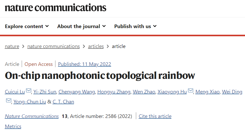文章信息:Cuicui Lu,* Yi-Zhi Sun, Chenyang Wang, Hongyu Zhang, Wen Zhao, Xiaoyong Hu,* Meng Xiao, Wei Ding,* Yong-Chun Liu, C. T. Chan, "On-chip nanophotonic topological rainbow", Nature Communications, 13, 2586 (2022).