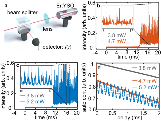 我們在實驗上清晰地觀察到了摻鉺晶體材料的連續相變。在激光驅動較弱時,材料展現出一般光學材料的吸收效果。逐漸增加激光強度時,材料首先會發生自發的時間平移對稱性破缺,然而這時體系的輸出是雜亂無章的,其內部仍然沒有建立起時間上穩定的周期性行為。當強度繼續增加到某個臨界值,系統就會展現出時間晶體的周期性振蕩行為。由于受到原子多體相互作用的保護,這樣的周期運動在很長時間范圍內都會保持穩定,并且具有長程的時間關聯性,其相干時間甚至超過了單個離子的相干時間。