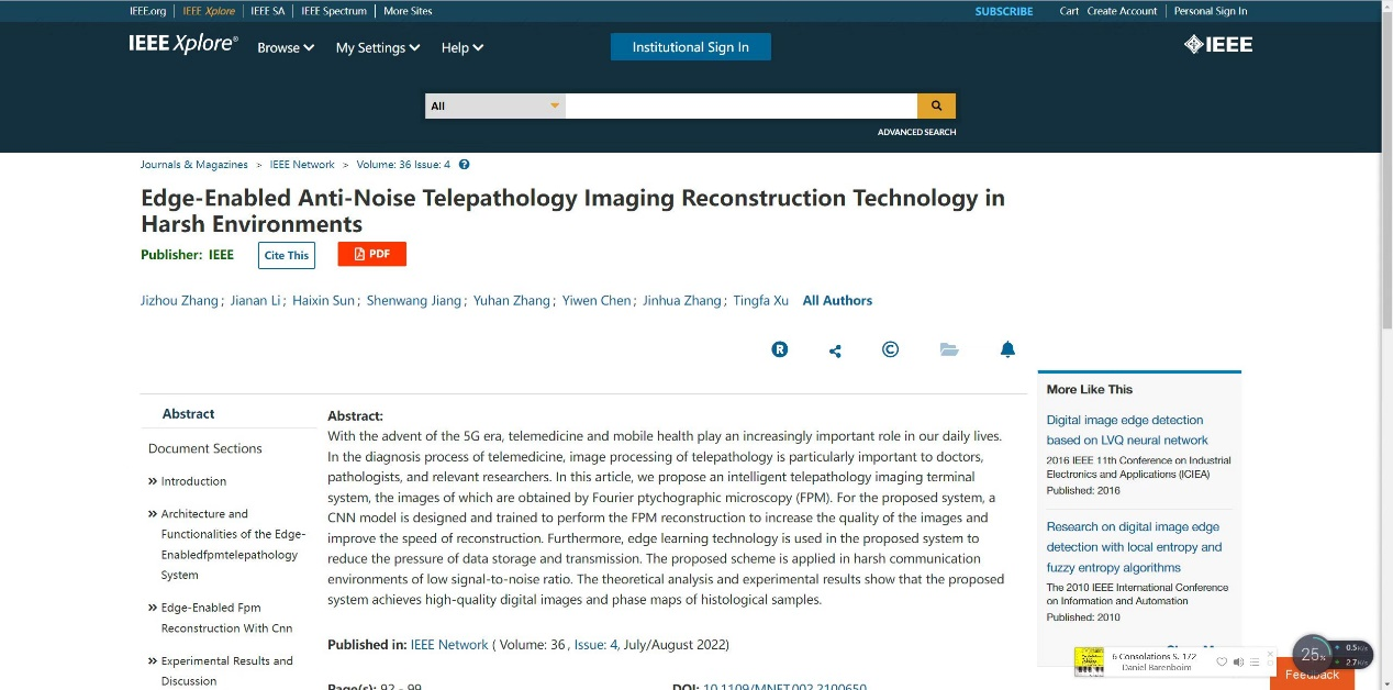 Zhang J, Li J, Sun H, et al. Edge-Enabled Anti-Noise Telepathology Imaging Reconstruction Technology in Harsh Environments[J]. IEEE Network, 2022, 36(4): 92-99.