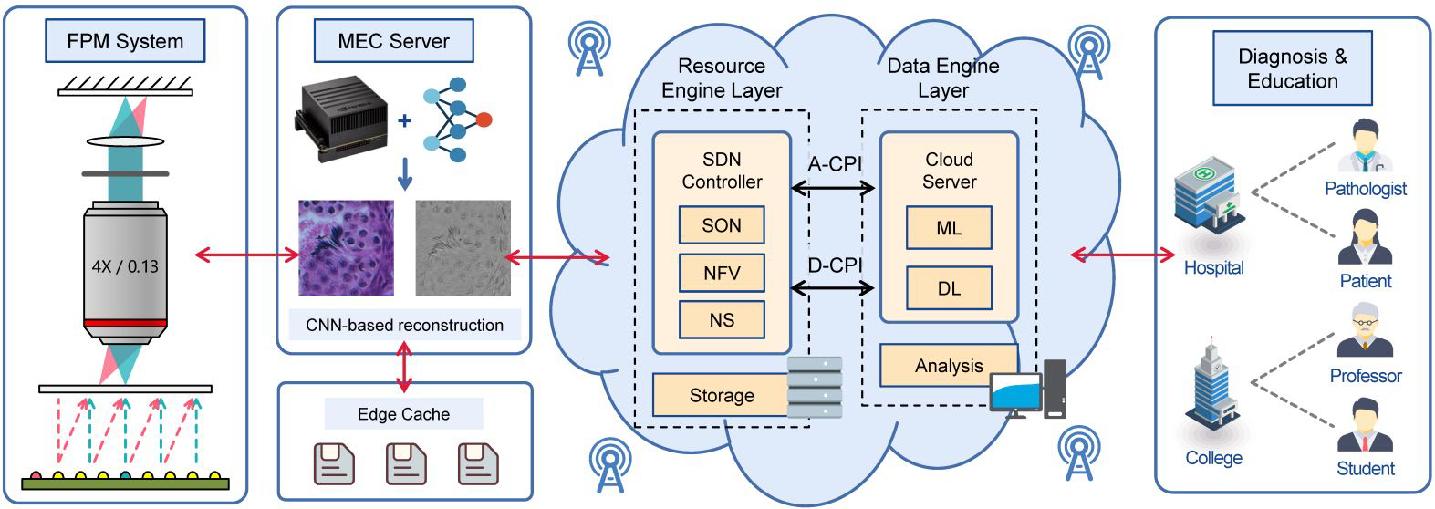 該系統利用編程式照明模塊的主動照明取代了機械掃描,結合生成對抗神經網絡實現多模態、高分辨率病理圖像的重建,降低了成本,提高了成像速度;實現了邊緣計算節點和網絡通訊節點的有機結合,提高了數據傳輸和通訊效率。該研究首次將傅里葉疊層顯微計算成像與邊緣計算相結合,為遠程病理成像和診療提供了新思路。