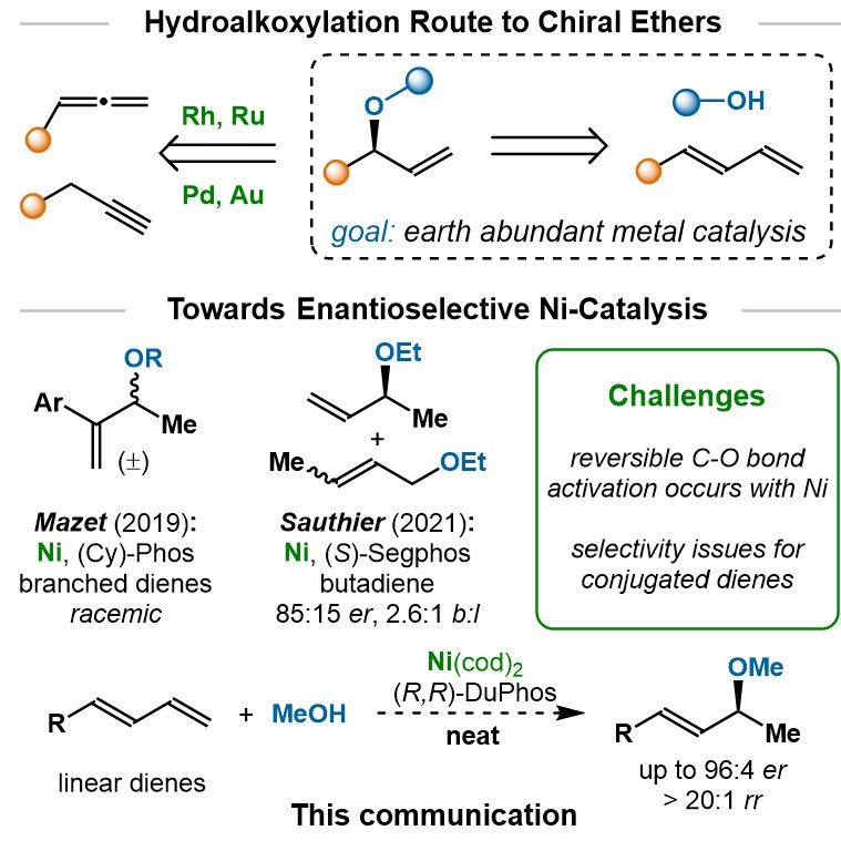 醚(C-O)鍵廣泛存在于藥物、農用化學品和功能材料中,其高效構筑吸引了研究者越來越多的關注。通常C-O鍵是通過Rh、Ru、Pd或Au等貴金屬催化的炔烴或聯烯的氫烷氧基化反應來構筑(圖1)。通過廉價易得的豐產金屬(例如Ni)催化1,3-二烯的氫烷氧基化來構建C-O鍵,最近引起化學家們的興趣。然而Ni催化1,3-二烯的氫烷氧化反應目前主要面臨兩個挑戰:1) Ni通常會可逆地活化C-O鍵,導致產物消旋化;2) 反應的區域選擇性問題。為了解決這些挑戰,近日北京理工大學楊小會課題組首次報道了無溶劑條件下Ni催化1,3-二烯的不對稱氫烷氧化反應,能以高對映選擇性和區域選擇性地構筑C-O鍵(圖1)。