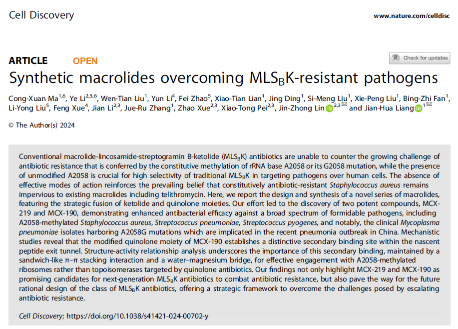 論文信息:Cong-Xuan Ma#, Ye Li#, Wen-Tian Liu, Yun Li, Fei Zhao, Xiao-Tian Lian, Jing Ding, Si-Meng Liu, Xie-Peng Liu, Bing-Zhi Fan, Li-Yong Liu, Feng Xue, Jian Li, Jue-Ru Zhang, Zhao Xue, Xiao-Tong Pei, Jin-Zhong Lin*, Jian-Hua Liang* Synthetic macrolides overcoming MLSBK-resistant pathogens. Cell Discovery, 2024, 10(75)DOI: 10.1038/s41421-024-00702-y