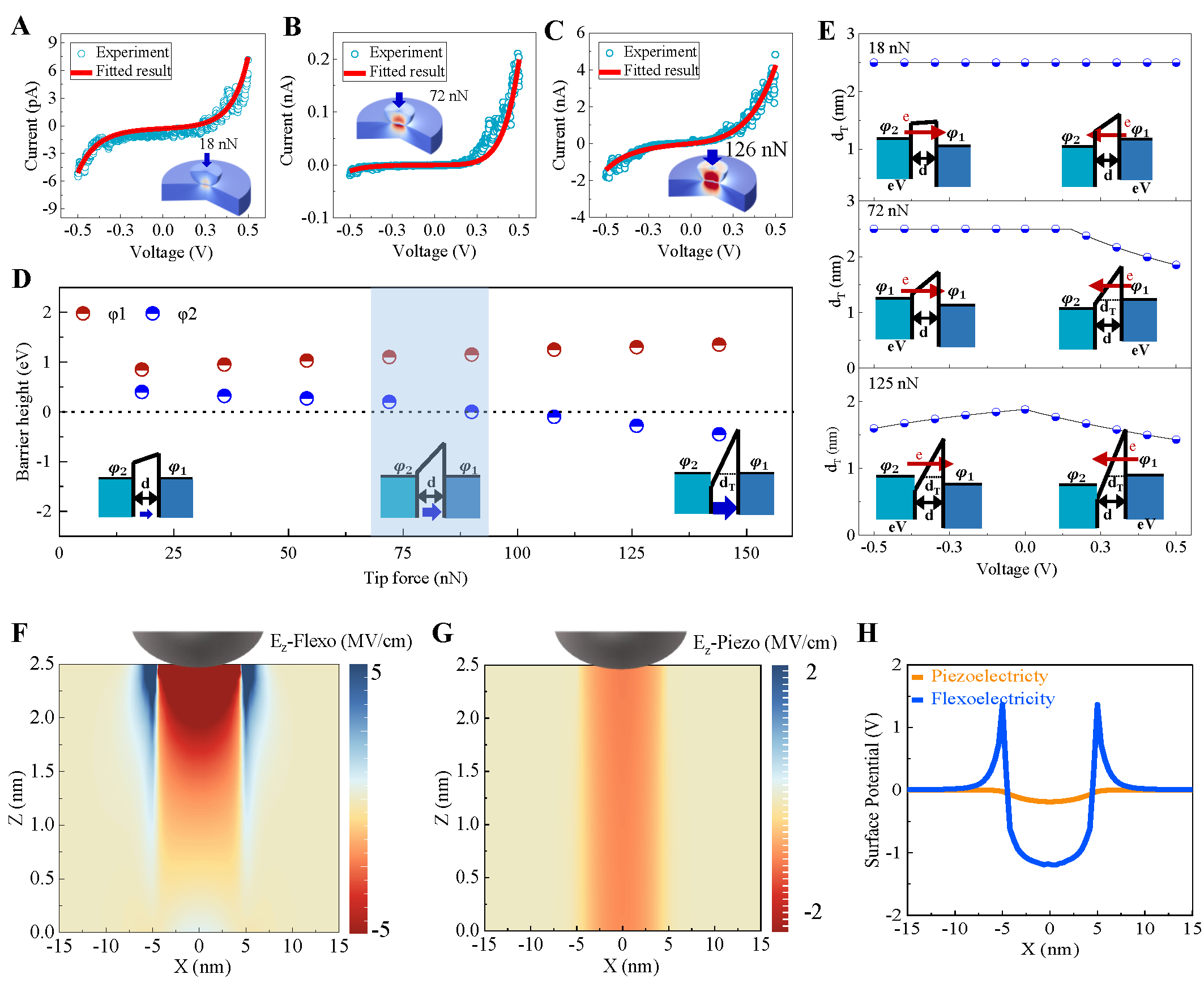 圖3. 針尖力增強CIPS電流整流效應的定量分析。(A至C) 不同針尖力下典型的I-V曲線及使用梯形和三角形隧穿勢壘模型進行擬合的結果。(D) 不同針尖力下上下界面隧穿勢壘的變化。插圖為隧穿勢壘的示意圖。φ1和φ2分別表示Pt/Ir針尖-樣品界面和樣品-Au襯底界面的隧穿勢壘。(E) 針尖力為18、72和125 nN時隧穿厚度 d T的變化。插圖為勢壘變化的示意圖。(F和G) 分別為針尖力為144 nN時計算得到的壓電場和撓曲電場(Ez-piezo和Ez-flexo)。(H) 根據壓電/撓曲電場計算得到的針尖-樣品接觸處的表面電勢。