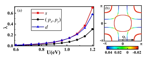 北京理工大學(xué)物理學(xué)院楊帆教授課題組與合作者通過(guò)細(xì)致分析實(shí)驗(yàn)現(xiàn)象,提出“交換密度波漲落”的超導(dǎo)機(jī)理。基于此觀點(diǎn),他們首次采用無(wú)規(guī)相近似方法對(duì)材料的宏觀性質(zhì)作了系統(tǒng)的微觀理論計(jì)算,結(jié)果顯示超導(dǎo)的配對(duì)對(duì)稱(chēng)性為s±-wave(圖1)。該觀點(diǎn)受到鎳基超導(dǎo)研究領(lǐng)域的廣泛認(rèn)同和跟進(jìn),成為該研究領(lǐng)域有影響力的觀點(diǎn)之一。