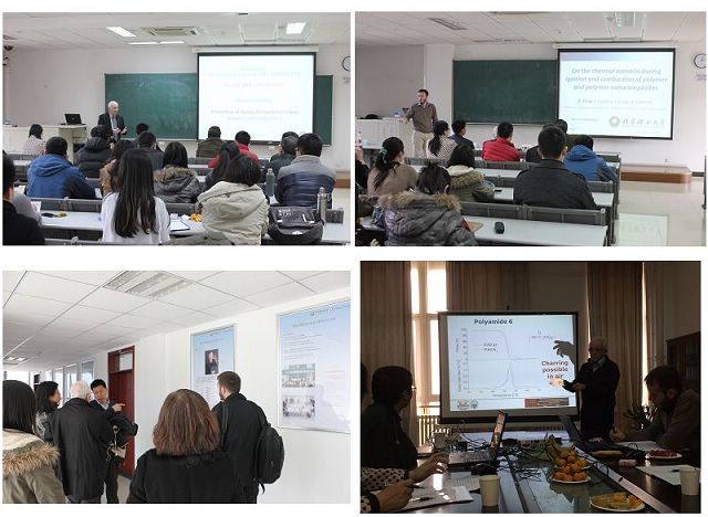 訪問期間,Camino教授和Fina副教授為北京理工大學師生精心準備了三場講座:“Biobased materials and green chemistry:Issues and challenges”,“Novel nanocomposite fire retardants and mechanistic studies”,“The thermal scenario during ignition and combustion of polymers and polymer nanocomposites”。學術講座由北京理工大學國家阻燃材料工程技術研究中心主任楊榮杰教授主持,阻燃實驗室老前輩王建祺教授也參加并點評。