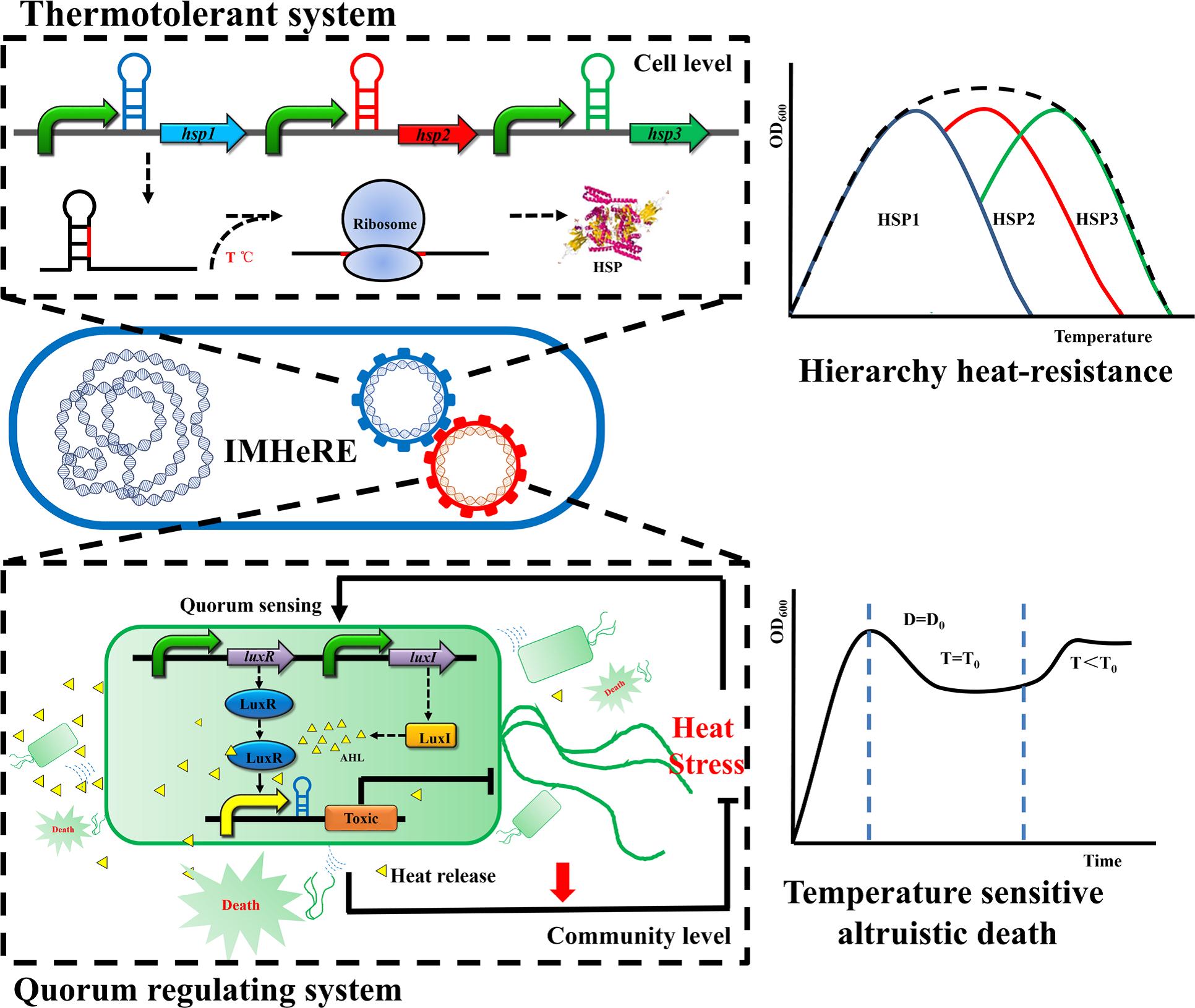 。。微生物智能熱量調(diào)節(jié)引擎的設(shè)計及應(yīng)用(IMHeRE),創(chuàng)造性地實現(xiàn)并大幅度提高了大腸桿菌的耐熱能力。IMHeRE主要包括微生物耐熱基因線路和數(shù)量調(diào)控基因線路。耐熱線路包括從嗜熱微生物中篩選得到的熱激蛋白(HSPs)作為耐熱功能元件,以及人工設(shè)計的RNA溫度響應(yīng)開關(guān)作為調(diào)控元件,利用對不同溫度響應(yīng)的RNA溫度響應(yīng)開關(guān)調(diào)控在不同溫度下效果最佳的HSPs實現(xiàn)了大腸桿菌的梯級耐熱,成功地將大腸桿菌的最適生長溫度拓寬到了37-40℃。數(shù)量調(diào)控線路則利用微生物群體感應(yīng)系統(tǒng)和RNA溫度響應(yīng)設(shè)計的“與”門開關(guān),同時響應(yīng)溫度和細(xì)胞密度兩個參數(shù)來動態(tài)開啟安全可控的毒性-抗毒性系統(tǒng)(TA),實現(xiàn)微生物的利他性程序化死亡,減少了代謝熱的釋放同時提高了營養(yǎng)物質(zhì)的利用率, 從而在菌群層面上提高了微生物適應(yīng)熱脅迫的能力。最后,通過兩個系統(tǒng)的協(xié)同作用,IMHeRE提高了大腸桿菌對特定高溫以及高溫波動的適應(yīng)性與魯棒性。將該引擎應(yīng)用于賴氨酸40℃高溫發(fā)酵,發(fā)現(xiàn)賴氨酸產(chǎn)量較對照組提高了5倍,IMHeRE顯著的改善了賴氨酸菌株在高溫下的生產(chǎn)能力,提高了生產(chǎn)效率、降低控溫能耗。另外,由于提高了發(fā)酵溫度,還可以節(jié)省糖化步驟之后的冷卻費(fèi)用。