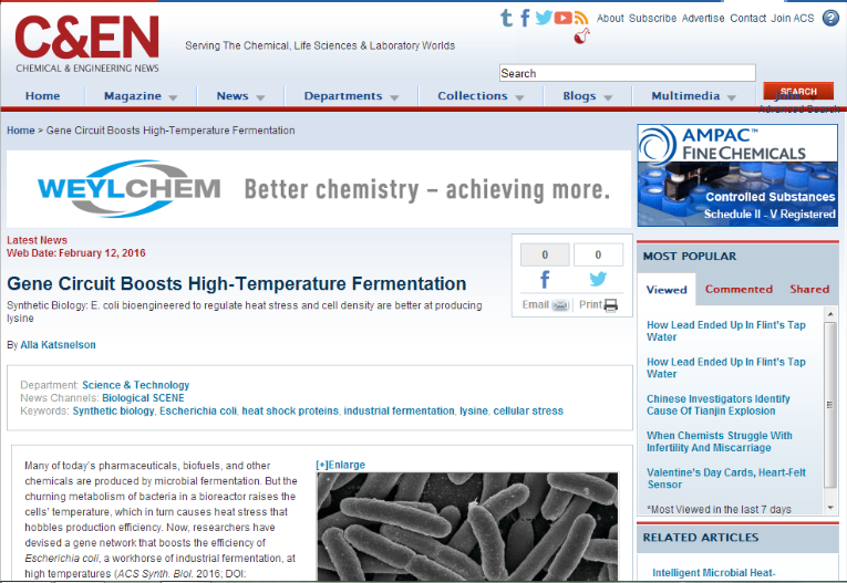 。。該成果發(fā)表在國際合成生物學(xué)頂級刊物美國化學(xué)學(xué)會ACS Synthetic Biology(2016,DOI:10.1021/acssynbio.5b00158)上,并被C&EN在2016年2月作為重要科研進(jìn)展進(jìn)行新聞報道(http://cen.acs.org/articles/94/web/2016/02/ Gene-Circuit-Boosts-High-Temperature.html?type=paidArticleContent, 圖2)。該方法也已申請國家發(fā)明專利(CN105002188A)。