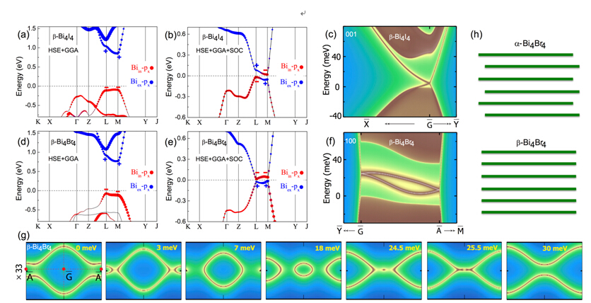 圖2電子結構。(a) (b) ?-Bi4I4有無自旋軌道耦合的能帶結構。(c) ?-Bi4I4的(001)表面態。(d)(e) ?-Bi4Br4有無自旋軌道耦合的能帶結構。(f) ?-Bi4Br4的(100)表面態。(g) ?-Bi4Br4的(001)表面態的Lifshitz轉變。(h) / ?-Bi4Br4的堆垛示意圖。