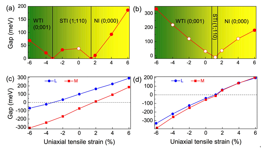 在前期研究該類二維大能隙拓撲絕緣體的工作基礎上(Nano Lett. 14,4767 (2014)),最近,北理工物理學院量子功能材料設計與應用實驗室劉鋮鋮博士、周金健博士生、姚裕貴教授和德州大學達拉斯分校的張帆博士合作提出了弱拓撲絕緣體可以在范德瓦爾斯(van der Waals)材料-beta-Bi4X4(X=Br,I)中實現并可以容易地被實驗驗證。如圖1所示,該類材料的基本構建單元是一維的原子鏈。垂直于該原子鏈方向的兩個晶面(100)和(001)都是解理面。本征的beta-Bi4Br4、beta-Bi4I4分別是弱拓撲絕緣體和強拓撲絕緣體。他們還發現單軸應變可以使得體系發生拓撲相變。在不同的應變區,可以得到強拓撲絕緣體、弱拓撲絕緣體以及普通的能帶絕緣體,如圖3所示。對于弱拓撲絕緣體,在(001) 解理面是沒有拓撲表面態的,而在(100) 解理面,出現了兩個各向異性的表面Dirac錐,見圖2。并且,當對該體系進行電荷摻雜時,可以發現該表面態發生了四次Lifshitz轉變。alpha-Bi4Br4、alpha-Bi4I4由于其元胞沿c方向長度加倍,相應的高對稱點都反帶兩次,所以都是拓撲平庸的能帶絕緣體。值得特別指出的是,如圖4所示,在從弱拓撲絕緣體到強拓撲絕緣體轉變的同時破缺體系的反演對稱性,會出現一個全新的Weyl半金屬相,即在兩個解理面都出現了費米弧(Fermi arc),但是只在(100) 解理面出現費米環(Fermi circle),我們稱之為復合的Weyl半金屬。