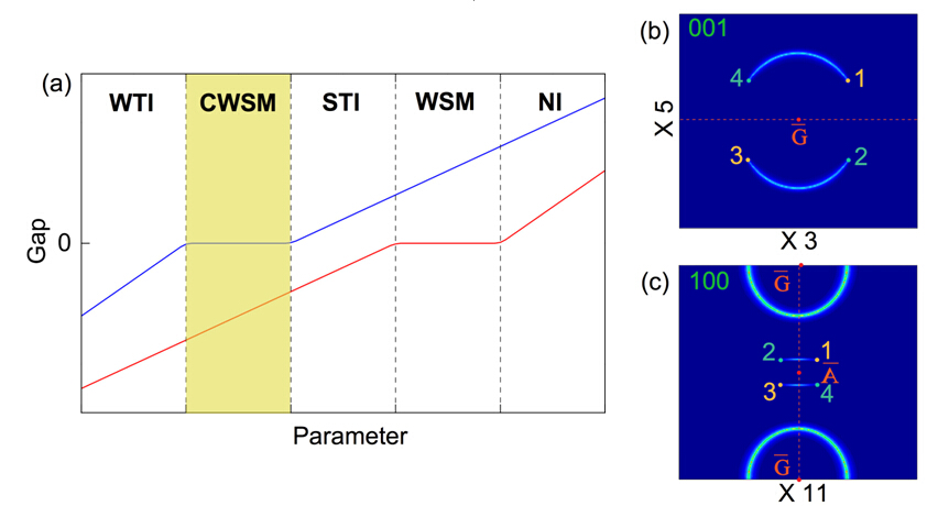 圖4(a)相圖。強弱拓撲絕緣體相變時可出現我們提出的復合Weyl 半金屬。而強拓撲絕緣體和能帶絕緣體的拓撲相變時可出現通常的Weyl 半金屬。(b) 復合Weyl 半金屬在(001)解理面的Fermi arc。(c) 復合Weyl 半金屬在(100)解理面共存的Fermi arc以及Fermi circle。