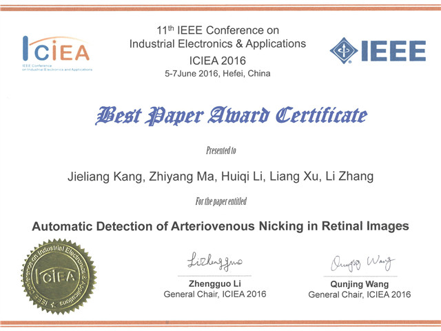 李慧琦教授課題組長期致力于醫學圖像處理與計算機輔助診斷研究,獲獎論文是關于眼底圖中動靜脈交叉壓迫的自動檢測研究。動靜脈交叉壓迫檢測對于高血壓和動脈硬化的早期診斷具有重要醫學研究價值。本論文是與北京同仁醫院北京眼科研究所合作發表的,我校為第一作者單位,第一、二、三作者為李慧琦教授課題組研究生康杰靚、馬志揚及李慧琦教授,第四、五作者徐亮、張莉為同仁醫院合作醫生。