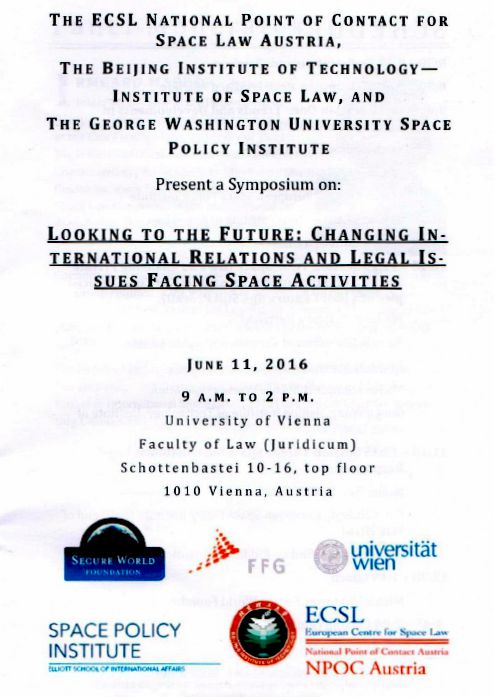 2016年6月11日,我校空間法研究所與喬治華盛頓大學空間政策研究所在維也納聯合舉辦題為“面向未來:變化中的國際關系和空間法問題”國際學術會議。參加本次大會的有來自美國、俄羅斯、奧地利、日本、德國等20多個國家的60位有關空間法律與政策的專家和政府官員。我國外交部參加聯合國外空委第59屆會議的代表團成員也參加了會議。會議由歐洲空間法中心奧地利聯系點維也納大學法學院負責承辦。