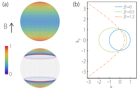 圖1:(a)朗道能級壓縮因子隨能量傾斜與磁場夾角的變化行為。(上):傳統外爾點,(下):第二類外爾點,其中紅線表示出現朗道能級坍塌的臨界角。(b)磁場下電子的半經典軌道隨磁場方向變化的演化行為。軌道由封閉變為開放對應于體系從具有良好定義的朗道能級到朗道能級的坍塌(外爾模型下的描述)。