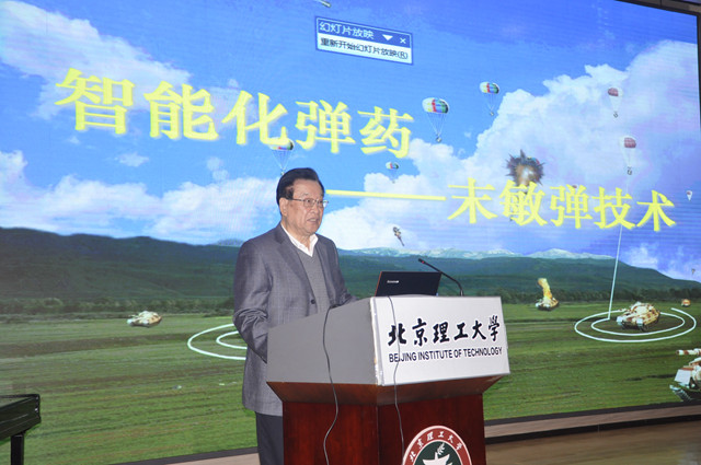 楊紹卿院士、陳小偉研究員、王成教授、錢新明教授、王海福教授作了報告。楊紹卿作了題為《智能彈藥——末敏彈》的報告,報告對智能彈藥——末敏彈從其概念到裝備部隊的型號,最后到末敏彈未來的發展進行了詳細介紹。讓同學們清晰地認識到了末敏彈研制過程中的困難以及克服的方法。