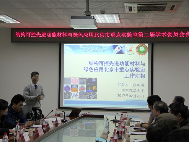 張加濤教授代表結(jié)構(gòu)可控先進功能材料與綠色應(yīng)用北京市重點實驗室圍繞重點實驗室建設(shè)情況和經(jīng)費使用情況、主要研究方向和研究內(nèi)容、2016年實驗室取得的研究成果和下一步發(fā)展規(guī)劃等方面向與會的各位專家領(lǐng)導(dǎo)作了匯報。