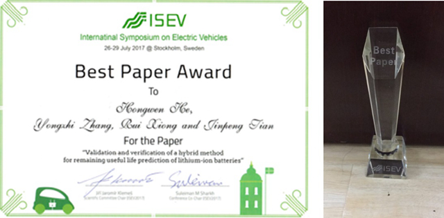 2017年7月26日至29日,在瑞典首都斯德哥爾摩舉辦的International Symposium on Electric Vehicles (ISEV2017) 國(guó)際學(xué)術(shù)會(huì)議中,我校機(jī)械與車輛學(xué)院電動(dòng)車輛國(guó)家工程實(shí)驗(yàn)室何洪文教授課題組的論文“Validation and verification of a hybrid method for remaining useful life prediction of lithium-ion batteries”獲得大會(huì)的Best Paper Award獎(jiǎng),并由大會(huì)主席Suleiman M Sharkh教授親自頒獎(jiǎng)。