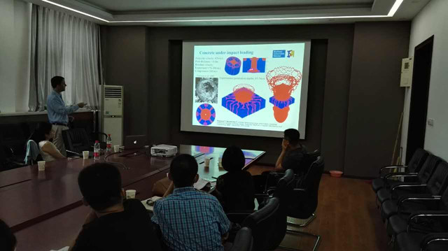 Timon Rabczuk教授是《International Journal of Impact Engineering》的副主編,無(wú)網(wǎng)格顆粒斷裂法的創(chuàng)始人,在計(jì)算固體力學(xué)、流體-固體相互作用等研究方向做出了基礎(chǔ)性和原創(chuàng)性的貢獻(xiàn)。已發(fā)表的論文他引超過(guò)9000次,被ISI分別列為“Engineering”和“Computer Science”兩個(gè)領(lǐng)域的高引用學(xué)者。報(bào)告中,Timon Rabczuk教授重點(diǎn)回顧了多尺度計(jì)算方法,提出了從原子模型到連續(xù)模型的一種簡(jiǎn)單而高效的計(jì)算算法,并在混凝土侵徹、薄壁殼體內(nèi)爆等典型的爆炸與沖擊問(wèn)題模擬中得到了很好的應(yīng)用。