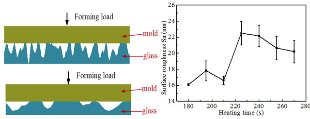 研究團隊分析了精密模壓成形玻璃微透鏡陣列過程中界面傳熱現象,建立了玻璃-模具界面熱阻的計算模型,并對玻璃精密模壓成形中加熱階段這一影響成形精度的重要一環進行了數值解析,提出了成形過程中壓平效應對成形表面粗糙度的演化理論,并通過試驗研究了加熱時間對成形玻璃透鏡表面粗糙度的影響規律,分析了界面黏接現象的產生原因。