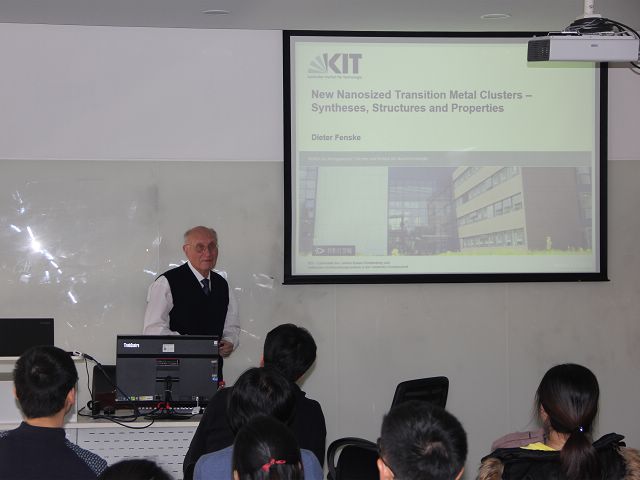 11月28日下午,Dieter Fenske教授在研究生樓5層東側報告廳做了學術報告,在介紹了德國Karlsruhe Institute of Technology (KIT)的材料、化學學科建設基礎上,介紹了他本人課題組在過渡金屬原子簇化合物,主族金屬元素簇合物與納米級團簇化合物從精確解析簇合物晶體結構角度的研究。Dieter Fenske教授所研究的有關金屬簇合物的原創性成果得到了世界上眾多同行的認可,產生了深遠的影響,發表Angew. Chem. Int. Ed.、Adv.Mater.等論文490余篇。報告深入淺出,大家爭相提問,現場氣氛熱烈,講座在大家的欲猶未盡中結束。會后與學院的青年教師李霄羽教授、李紅博教授等進行了深入的學術討論。