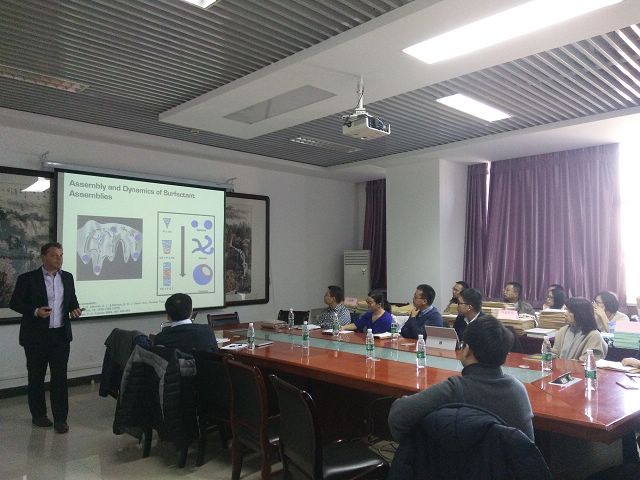 Giannesch教授概述了疾病響應傳遞系統的機制,介紹了通過開環歧化聚合的方法制備高功能化的聚合物支架,并將該支架運用于人體體內探針、多通道成像平臺以及藥物向靶組織的輸送等方向的研究。講解了液體環境透射電鏡技術,展示了用其原位觀察液體環境中納米材料的行為,以及在芯片和液體桿上集成加熱、冷凍元件,用于納米材料功能性測試。這一先進技術極大地拓寬了透射電鏡的研究范圍。報告深入淺出,在場師生積極提問,現場氣氛熱烈。Giannesch教授與李霄羽教授、張加濤教授、陳琪教授等就液體環境透射電鏡技術進行了深入的學術討論,講座在大家的意猶未盡中結束。