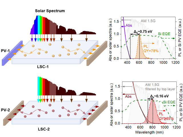 此研究論文基于涂布技術制備了疊層式的太陽能聚光器件,實現太陽能光譜的光子分級。該方法利用兩種熒光量子點,一種是基于錳離子摻雜結構的量子點,該量子點可以吸收高能量紫外光和部分藍光(440 nm),同時發出600 nm的熒光,另一種基于銅銦硒結構的量子點,該量子點可以吸收大部分的可見光,同時發出800 nm的熒光。該器件可以實現太陽能光譜中不同能量光子的分離,從而實現高效率的光伏輸出(3.8%)。