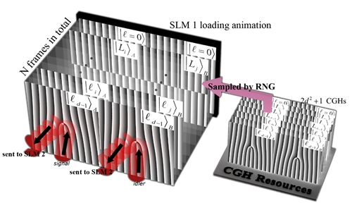 光的軌道角動量自由度由于其天然的高維屬性,自發現起就被廣泛應用于各類高維系統的構建中。在實驗中通過光的參量下轉換過程產生了軌道角動量光的最大糾纏態 (圖1),進而通過一系列測量觀測到了高維量子steering效應。圖2展示的是測量結果。用加載動圖的方式,定量的引入了一個可控的各向同性噪聲(圖3),并驗證了高維steering效應中的噪聲抑制現象(圖4)。